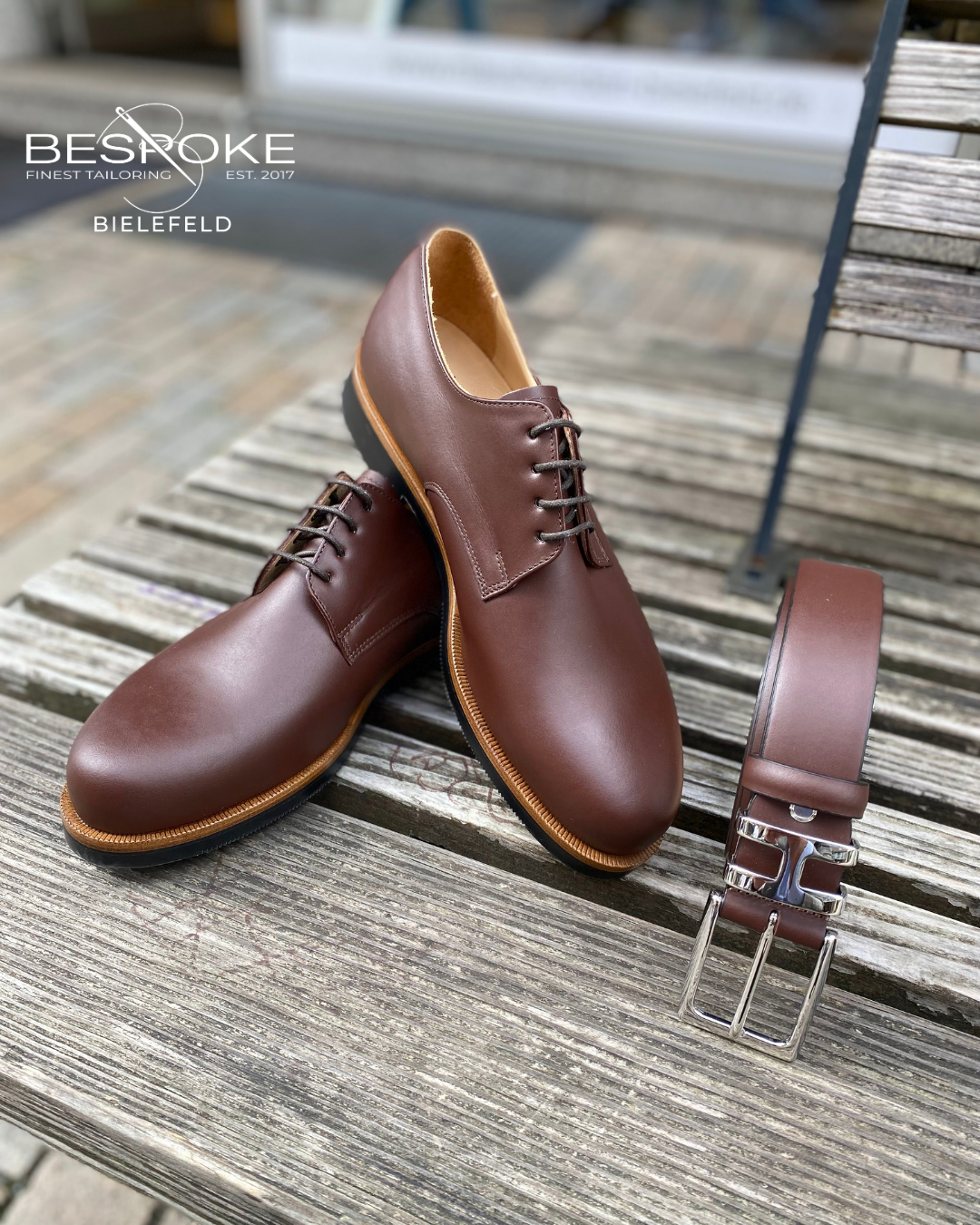 Du bist auf der Suche nach dem passenden Schuh für deinen großen Tag? Unser Derby aus braunem Kalbleder mit Gummisohle und Natur-Ausputz überzeugt nicht nur mit exklusivem Design, sondern harmoniert perfekt mit den angesagten Anzügen in Blau oder Grün. Mit dem passenden Ledergürtel bist du auch nach der Feier stilvoll unterwegs – ob im Business oder ganz entspannt im Alltag.