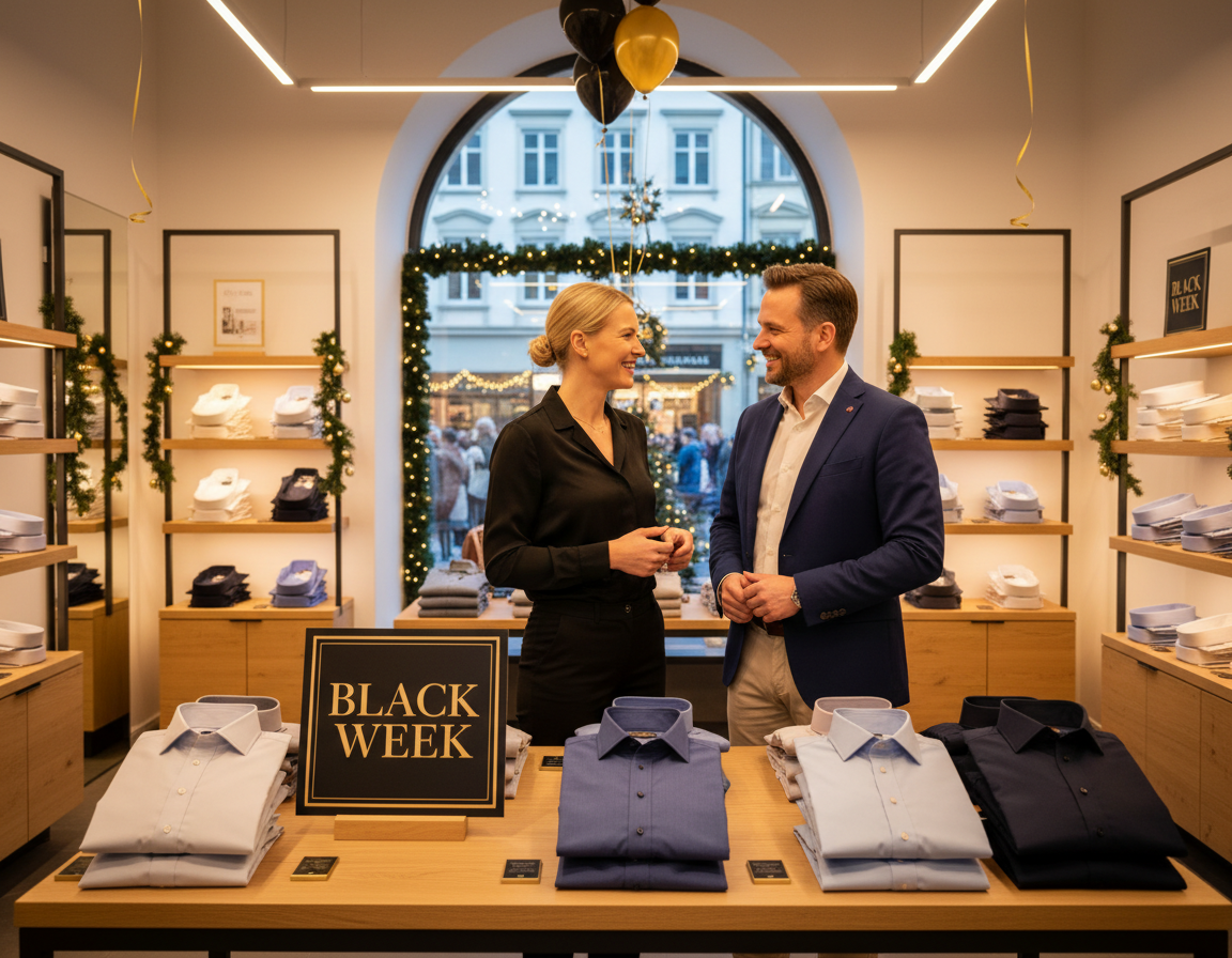 - BLACK WEEK-Aktion: 4 Maßhemden bestellen, nur 3 bezahlen (das kostenlose Maßhemd: Preiskategorie 149,95 €)
